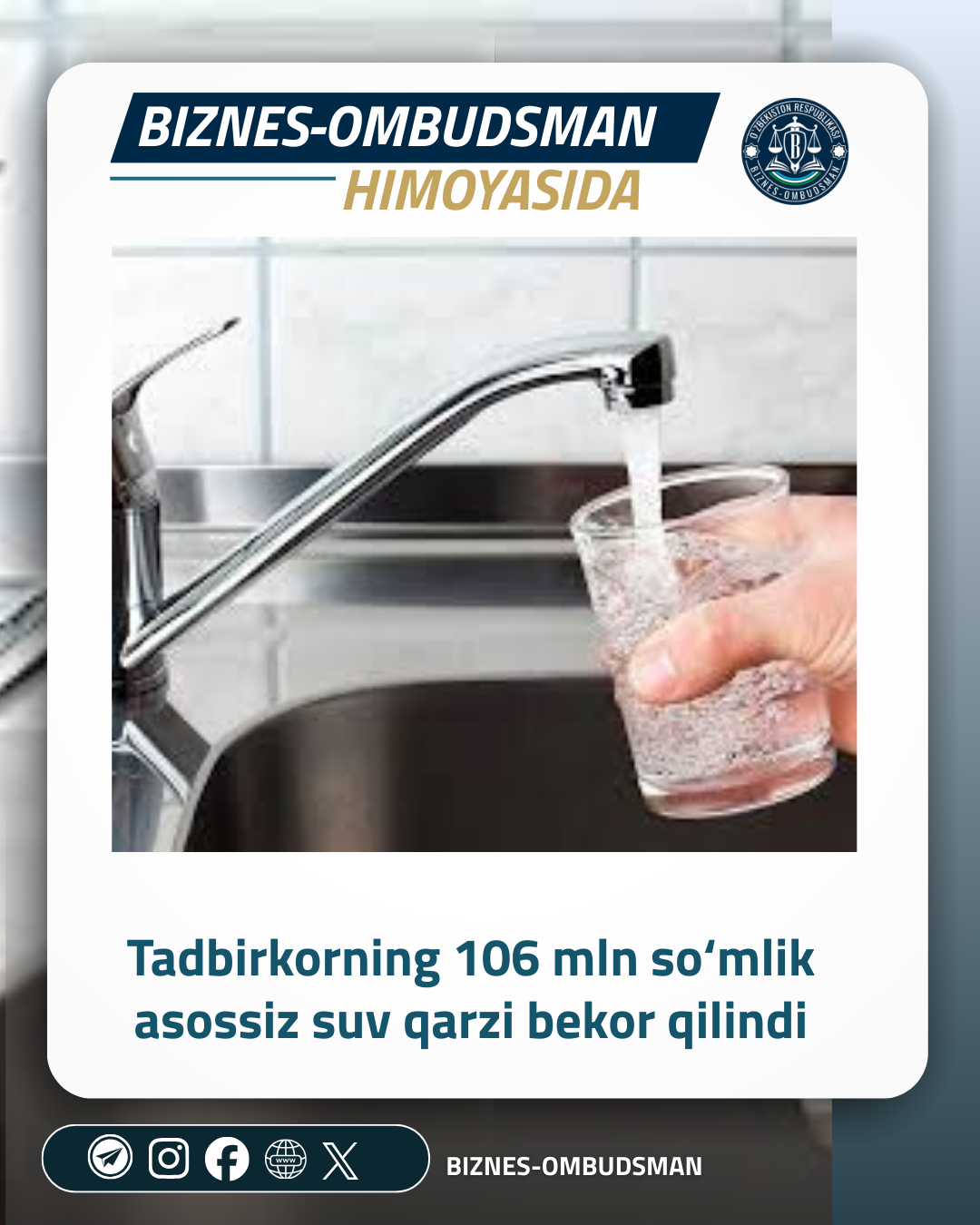 Toshkent viloyati Zangiota tumanida faoliyat ko‘rsatuvchi “N.S.M.” xususiy korxonasi mehmonxona binosi uchun ichimlik va oqova suv xizmatlaridan 106 million so‘mdan ortiq asossiz qarzdorlik hisoblanganidan shikoyat qilib Biznes-ombudsmanga murojaat qildi.
