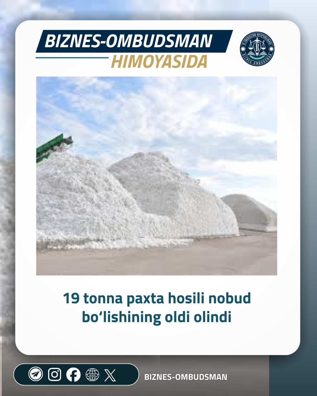 Natijada, tadbirkorning mehnat mahsuli bo‘lgan 19 tonna paxta hosili nobudgarchiliksiz qabul qilinishi ta’minlanib, xo‘jalikning iqtisodiy zarar ko‘rishiga yo‘l qo‘yilmadi.