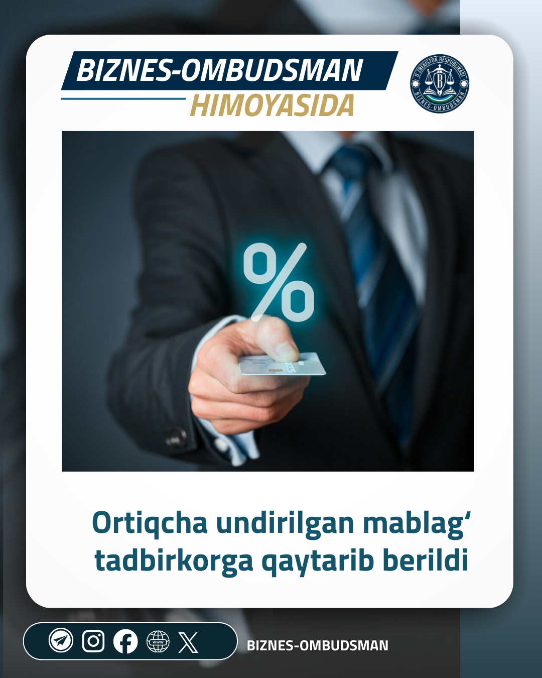 Бизнес-омбудсман ёрдамида тадбиркор фойдасига 104 миллион сўмдан ортиқ маблағ ундирилди