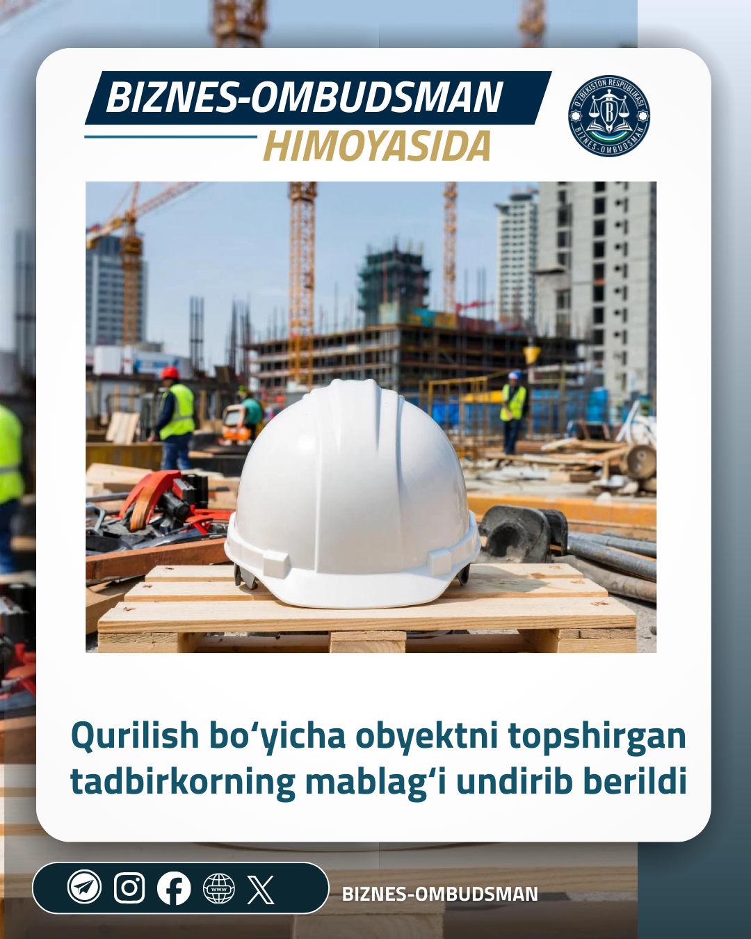 Biznes-ombudsman aralashuvi bilan toʻxtab qolgan yirik qurilish loyihasi qayta tiklandi
