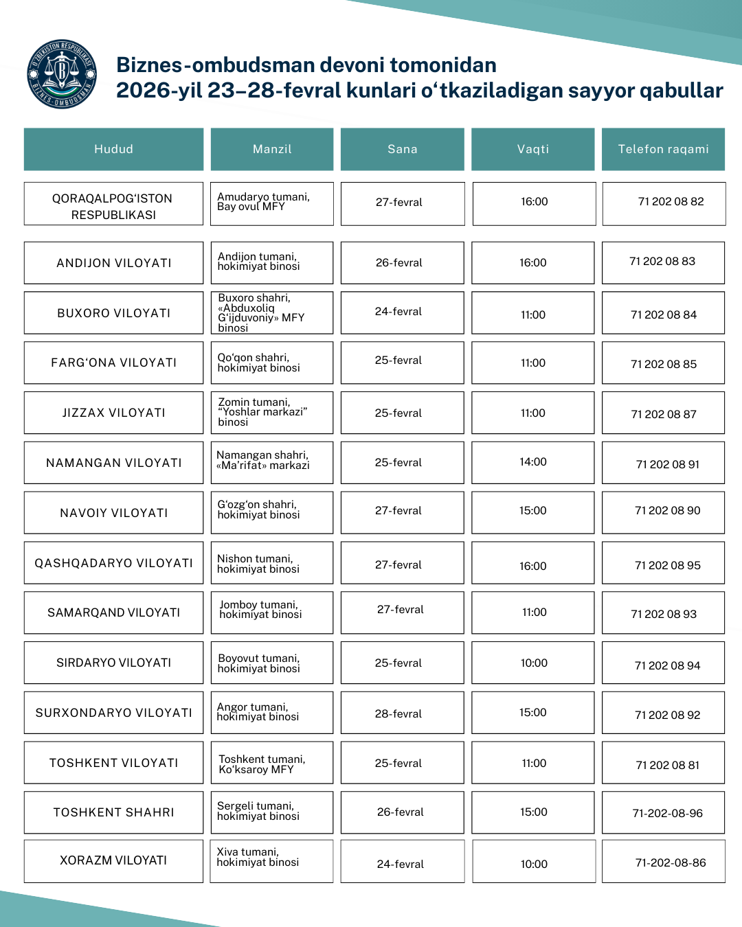 Biznes-ombudsman devoni tomonidan hududlarda sayyor qabullar o‘tkazilmoqda – FOTOREPORTAJ