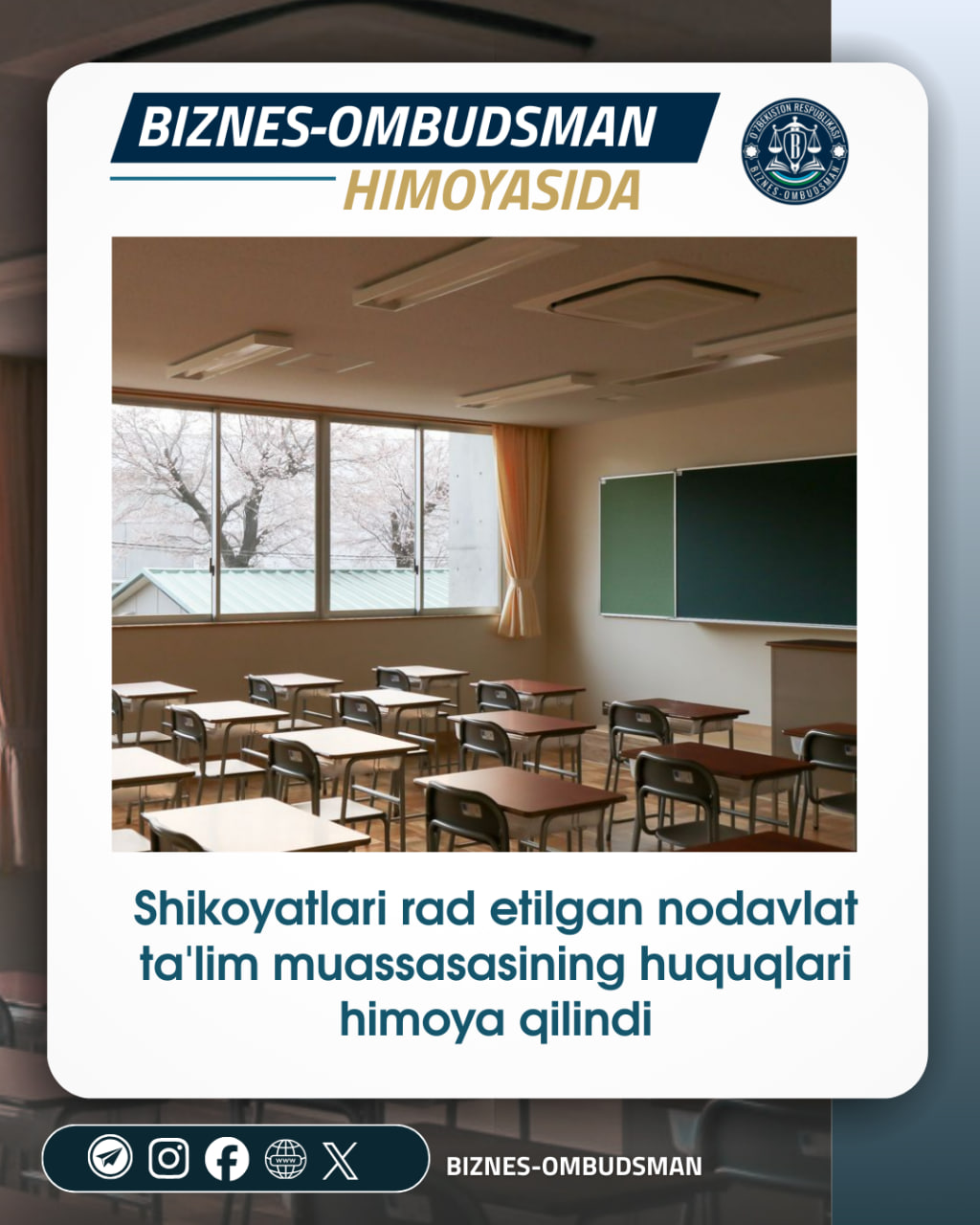 Buxoro viloyati G‘ijduvon tumanida faoliyat yurituvchi “O.T.A.” nodavlat ta’lim muassasasi unga nisbatan chiqarilgan jarimadan norozi bo‘lib Biznes-ombudsmanga murojaat qildi.