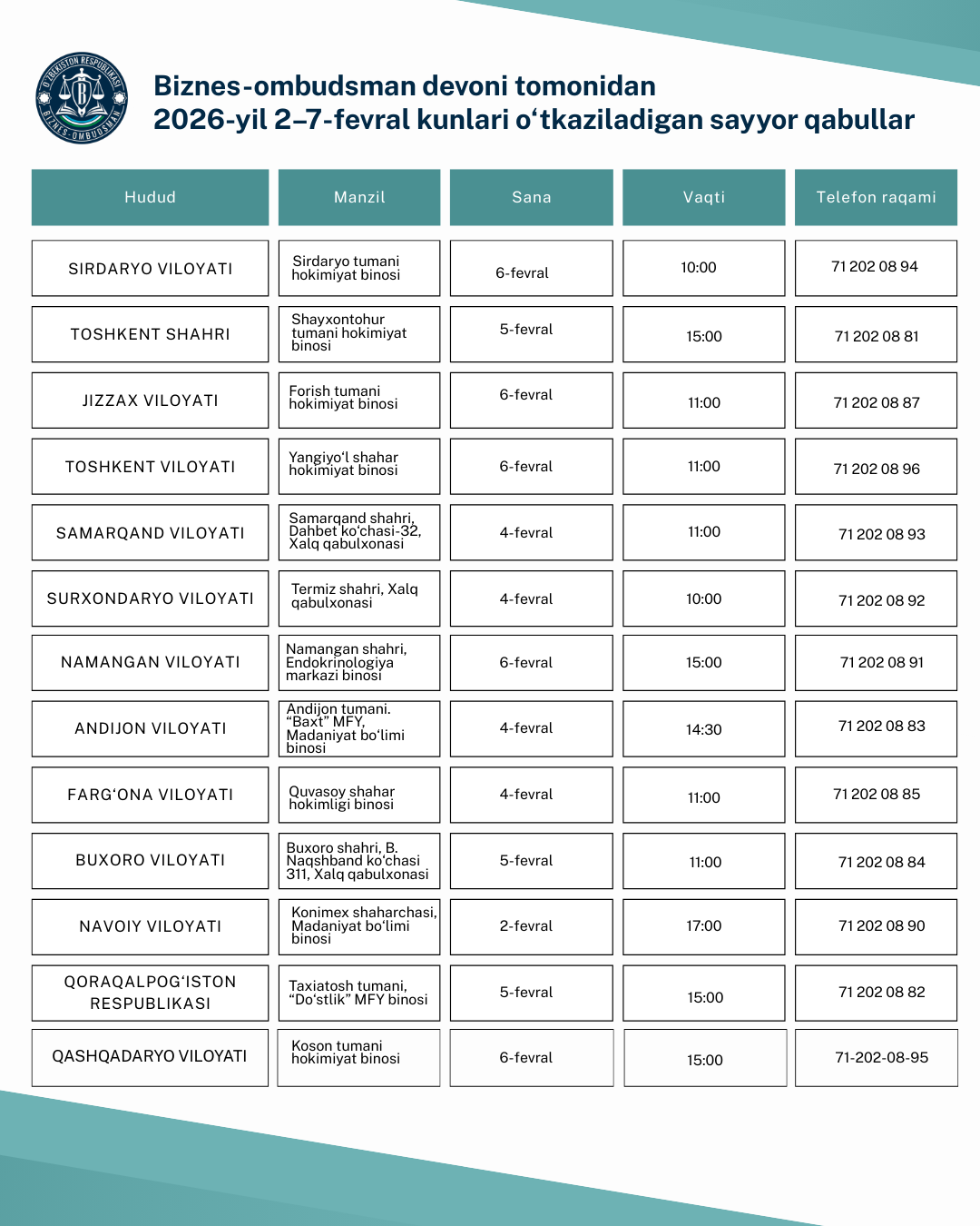 2026-yil 2-6-fevral kunlari yurtimiz bo‘ylab Biznes-ombudsman devoni tomonidan sayyor qabullar tashkil etiladi.
