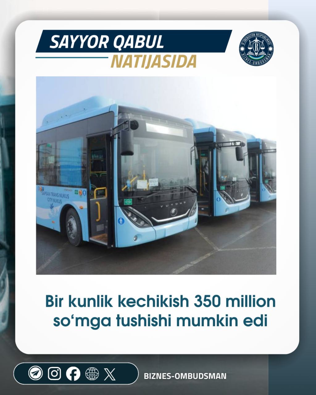 Biznes-ombudsman tomonidan joylarda o‘tkazilayotgan sayyor qabullar tadbirkorlarning muammolarini tezkor va samarali hal etishda muhim platforma vazifasini o‘tamoqda. Ana shunday qabullardan biri Qoraqalpog‘iston Respublikasida o‘tkazilgani haqida xabar bergandik. (https://t.me/biznes_ombudsman/10771)