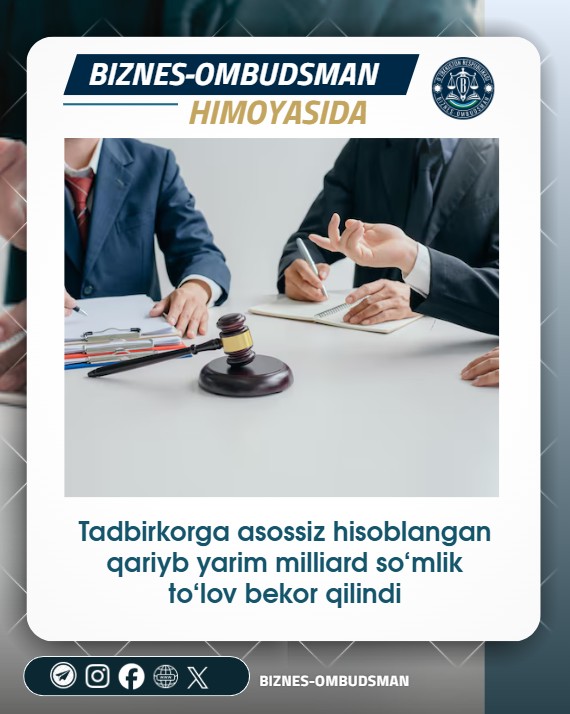 Biznes-ombudsman devoni tadbirkor manfaatini ko‘zlab sudga ariza bilan murojaat qildi. Sud ishni ko‘rib chiqib, Xorazm viloyati davlat soliq boshqarmasining 2025-yil 27-oktyabrdagi qarorini haqiqiy emas deb topdi.