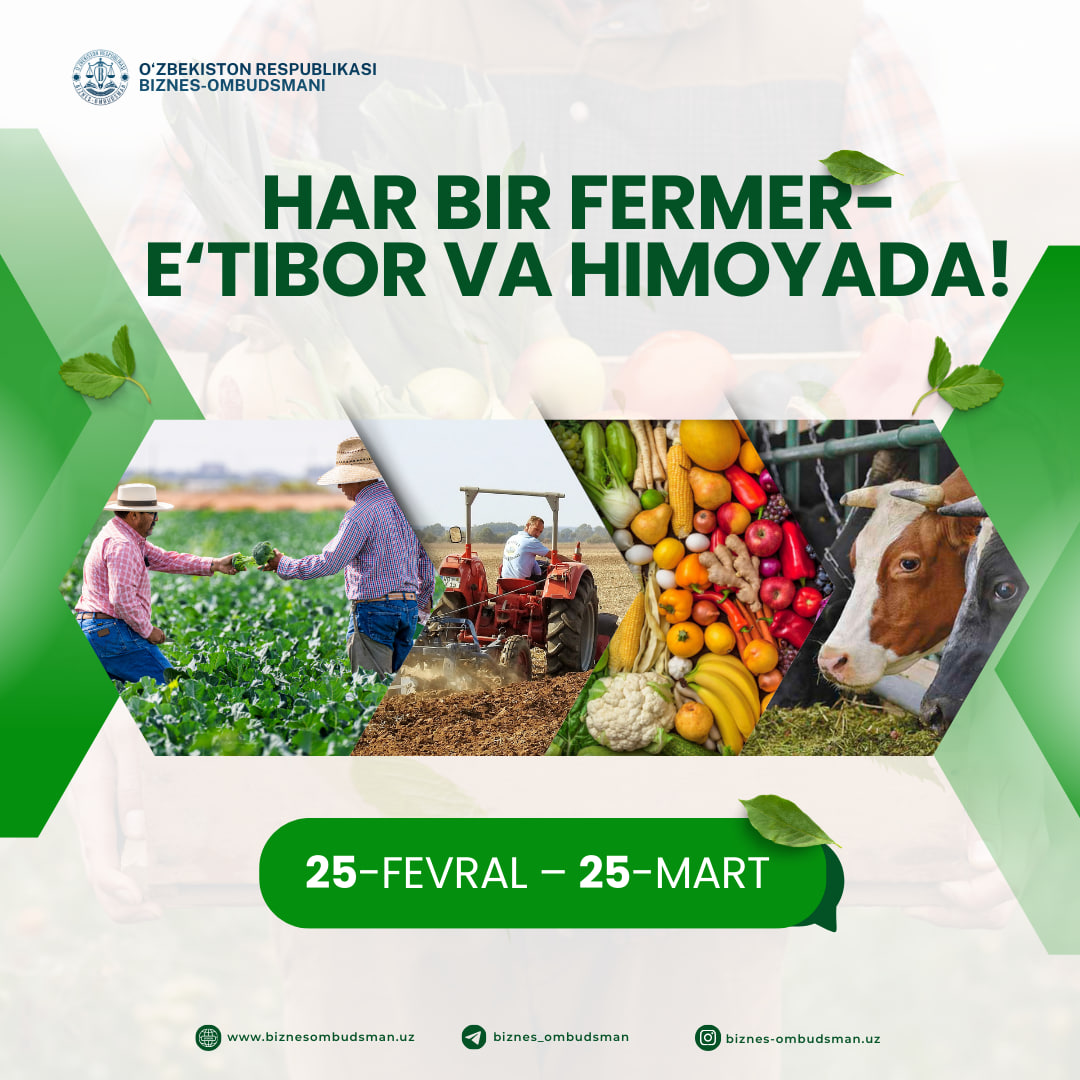 Bahorgi dala ishlari boshlanishi arafasida Biznes-ombudsman fermerlar va soha fidoyilarini yanada qo‘llab-quvvatlash maqsadida keng ko‘lamli tadbirni e’lon qiladi!