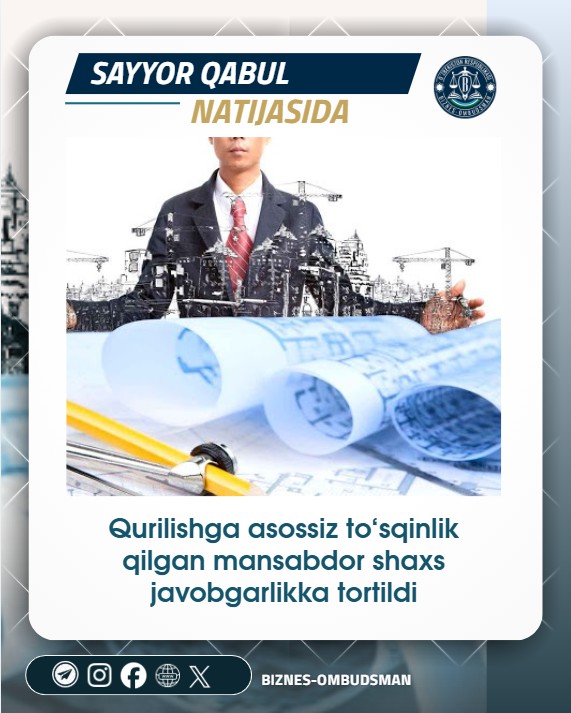Biznes-ombudsmanning shaxsiy qabulida Toshkent viloyatida faoliyat yuritayotgan tadbirkor murojaat qilib, ko‘p qavatli uy-joy qurish uchun barcha vakolatli idoralardan tegishli xulosalar olingan bo‘lsa-da, tuman qurilish bo‘limi ruxsat bermayotganini ma’lum qildi.