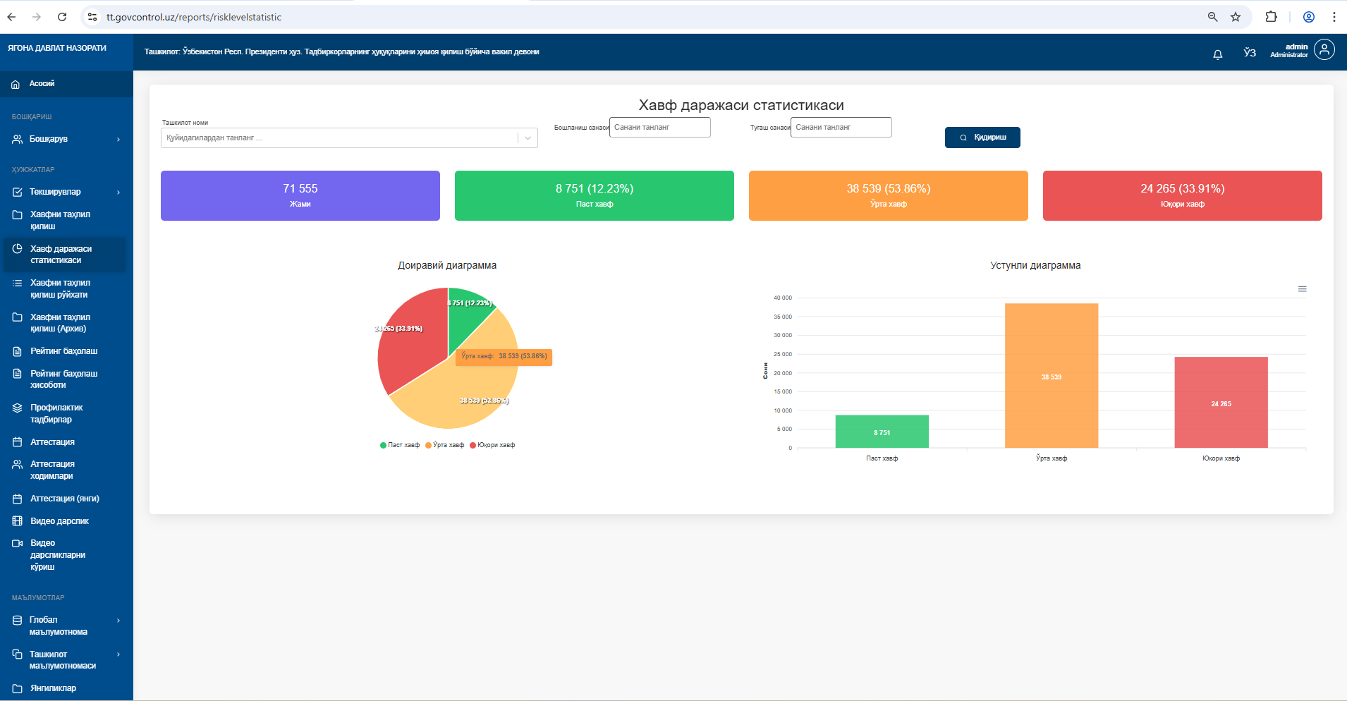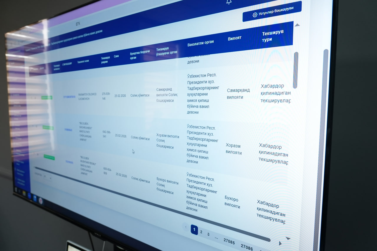 Respublika bo‘ylab o‘tkazilayotgan barcha tekshiruvlarni "Yagona davlat nazorati" axborot tizimi orqali real vaqt rejimida kuzatib borish.