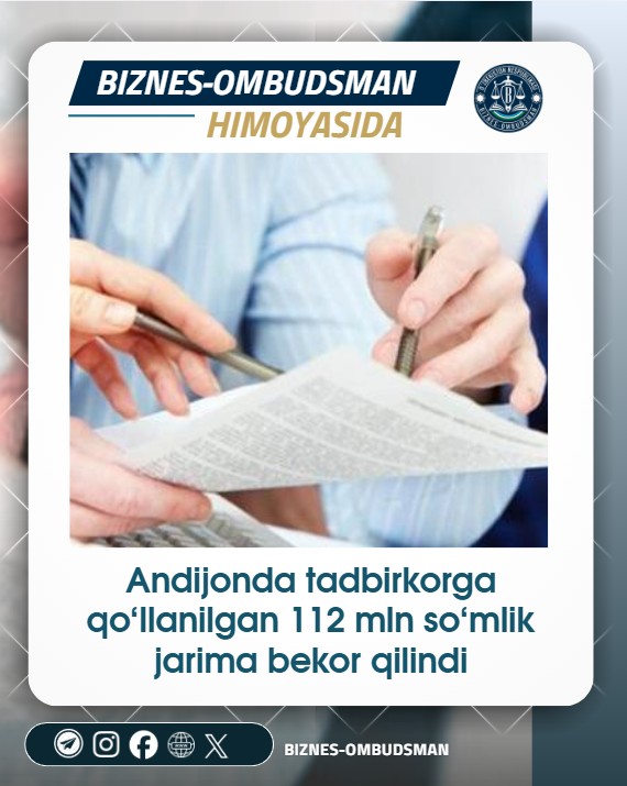 Biznes-ombudsman tomonidan tadbirkor manfaatida Andijon tumanlararo ma’muriy sudiga ariza kiritildi. Natijada, sud jarima qo‘llash to‘g‘risidagi qarorni bekor qildi hamda davlat organiga nisbatan xususiy ajrim chiqardi. Sud qarorida davlat idoralari o‘z faoliyatida qonuniylik va mutanosiblik tamoyillariga amal qilishi shartligi alohida ta’kidlandi.