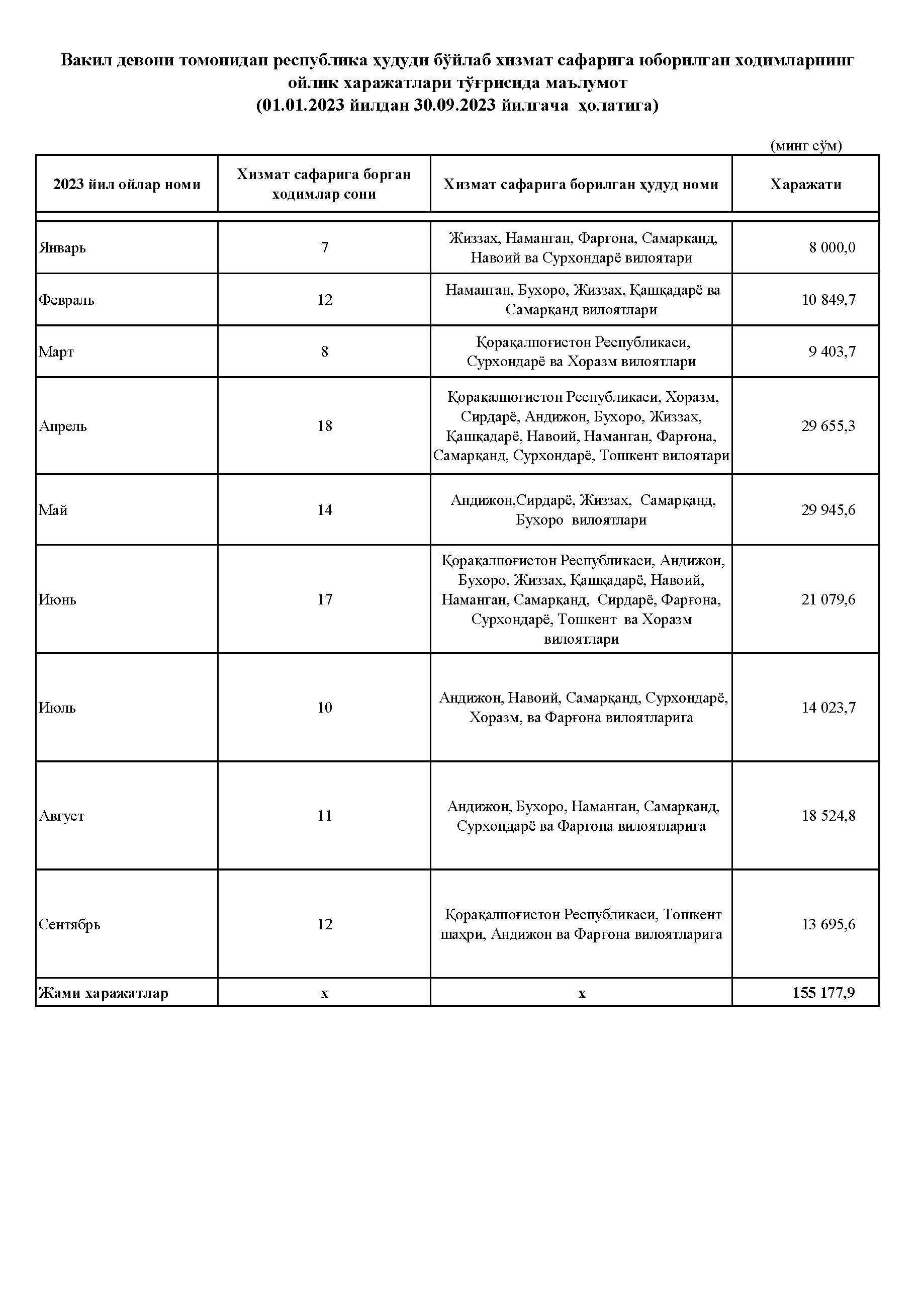 Сведения о ежемесячных расходах сотрудников, направляемых Аппаратом Уполномоченного в командировку по территории республики